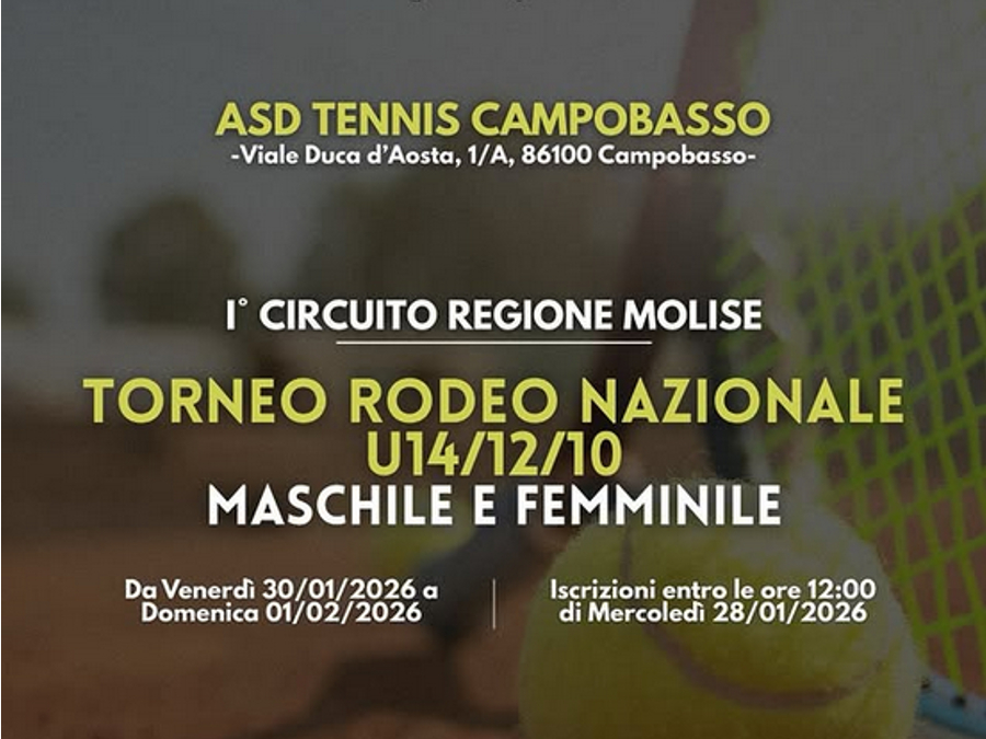 L’evento interamente finanziato dalla REGIONE MOLISE, è organizzato dall’Associazione Tennis Campobasso con la collaborazione della Molise Tennis Project. Lo staff garantisce vitto e alloggio agli atleti provenienti da fuori regione. Il rodeo andrà in scena nell’ultimo week-end di questo mese.